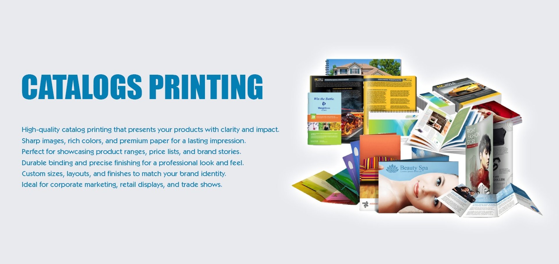 High-quality catalog printing uses premium paper, vibrant color printing, and durable binding options such as saddle stitching, perfect binding, or spiral binding to ensure long-lasting performance and a premium look. Customization options allow businesses to choose the size, finish (matte or glossy), paper thickness, and design style that best reflects their brand identity. A well-designed catalog not only improves product presentation but also strengthens brand credibility and creates a strong visual impression on customers.