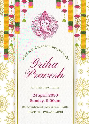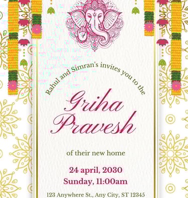 Announce your house warming ceremony with stylish and graceful invitation cards. Crafted with modern designs and traditional elements, these invites perfectly reflect the excitement of your new space while inviting family and friends to join in a celebration filled with warmth and positivity.