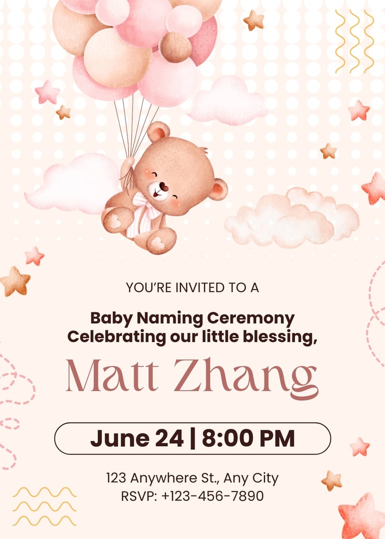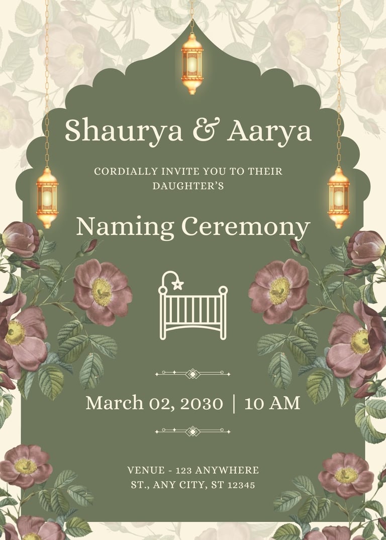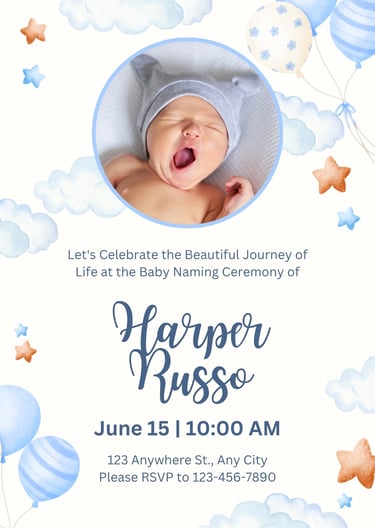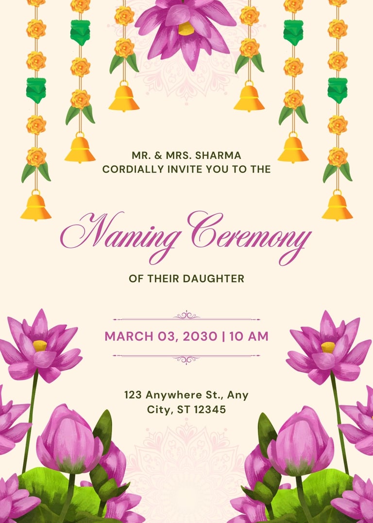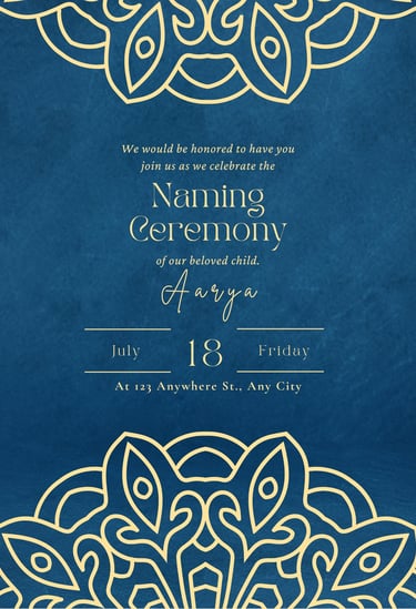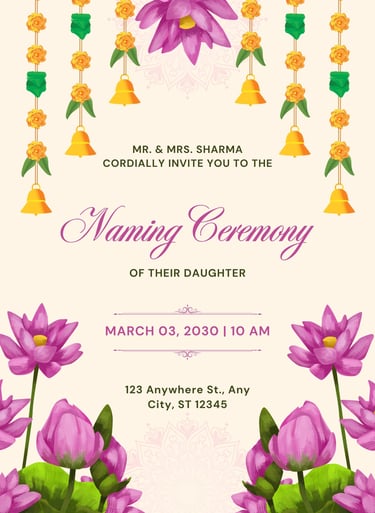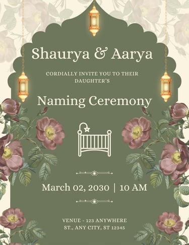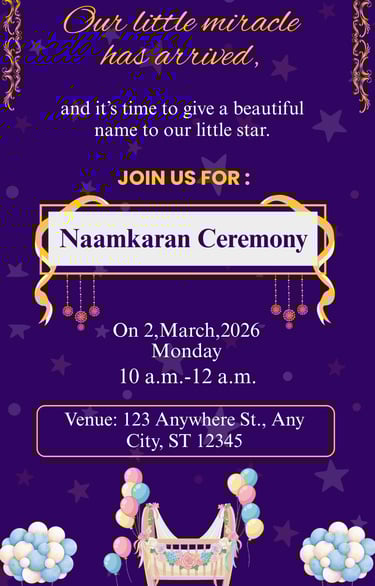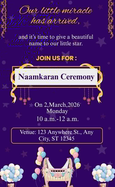 Make your naming ceremony extra special with thoughtfully designed invitation cards. Blending modern creativity with traditional warmth, these invitations highlight every detail of your event while inviting guests to join you in celebrating your baby’s identity and the beginning of a wonderful journey.