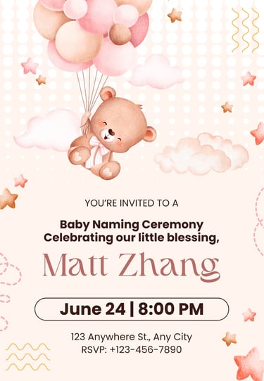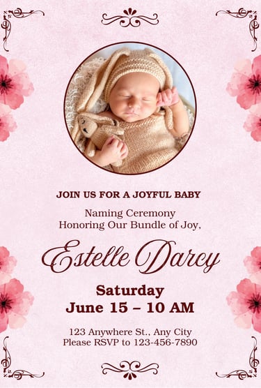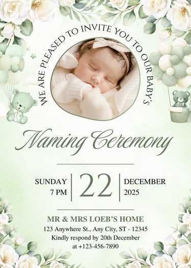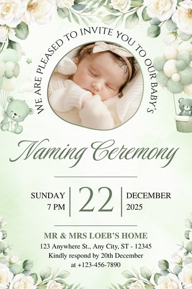 Celebrate your baby’s naming ceremony with elegant invitation cards that reflect love and joy. Designed with soft colors, adorable themes, and personalized details, these invitations warmly invite your loved ones to bless your child and be part of this precious and memorable occasion.