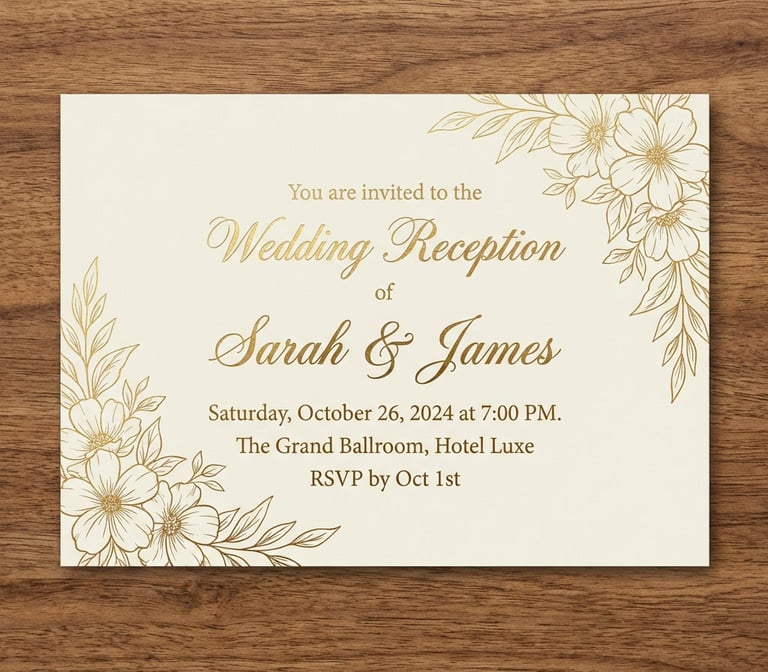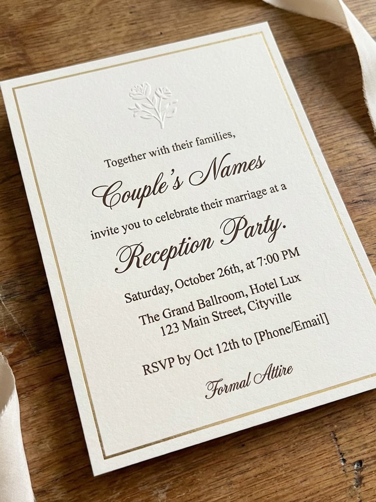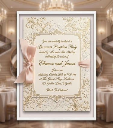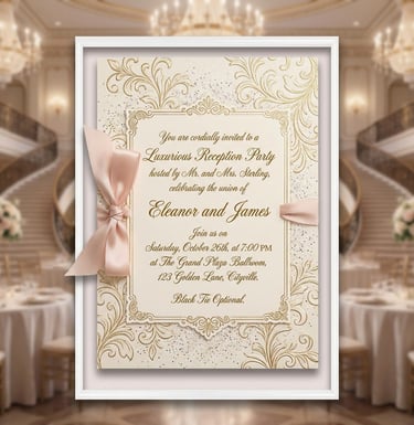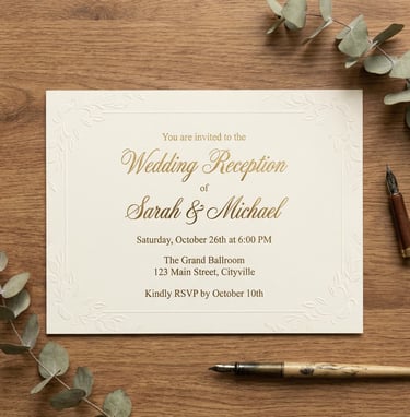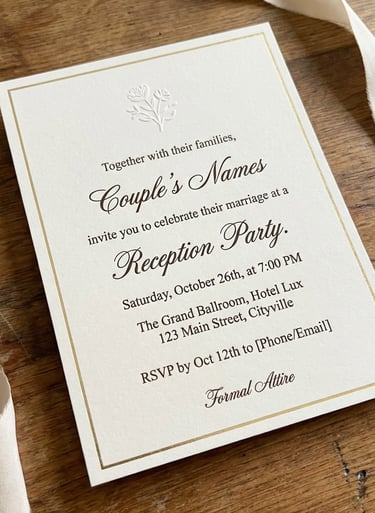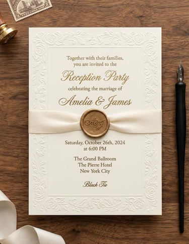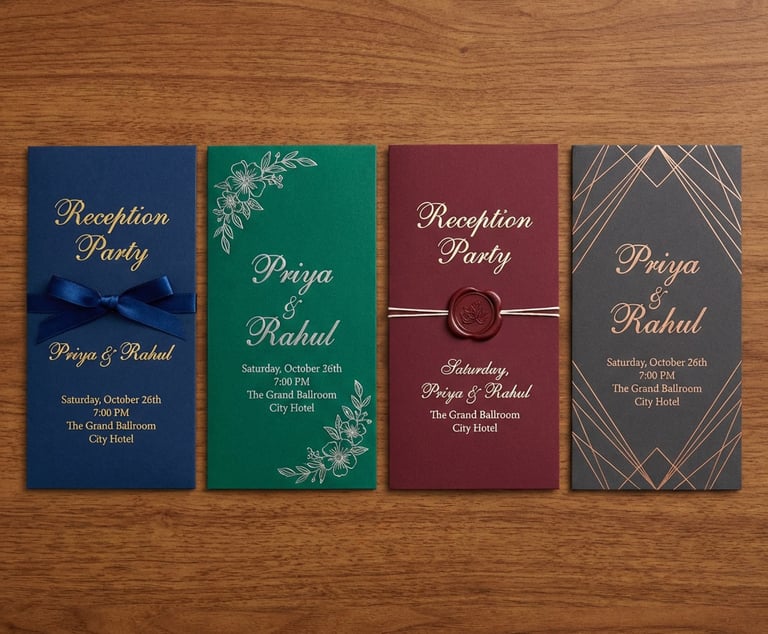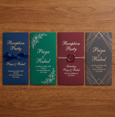 Make your reception party stand out with sophisticated and eye-catching invitation cards. Featuring graceful designs, rich textures, and personalized elements, these invites create excitement and set the perfect tone for a celebration where friends and family gather to honor your special occasion.