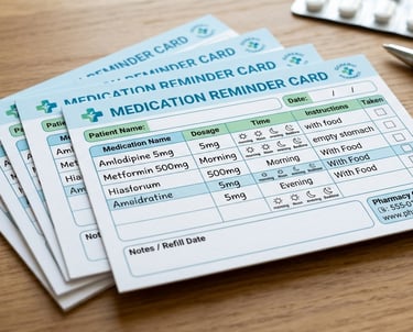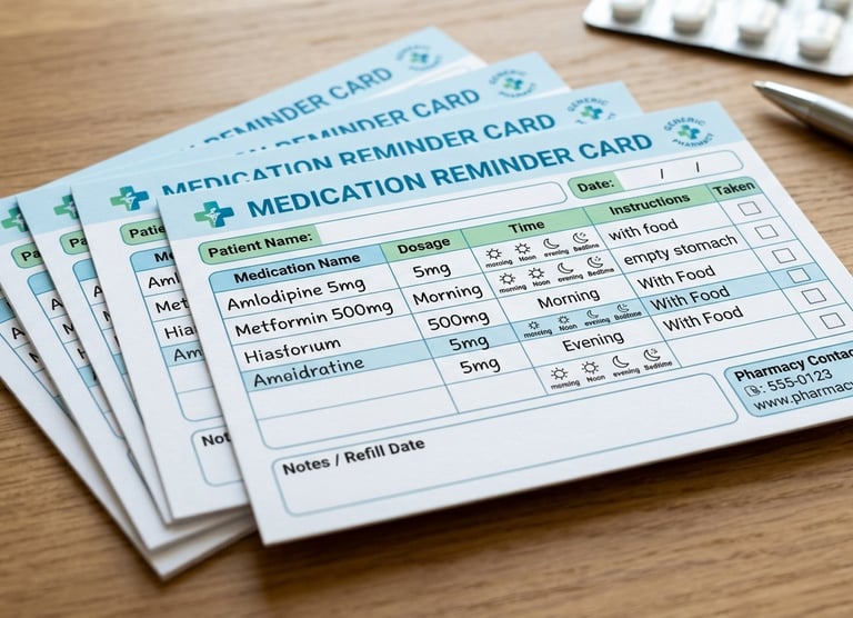 A6 size reminder cards (105 × 148 mm) are compact, practical cards designed to deliver essential information such as medication schedules, appointment dates, and health instructions in a clear and organized format. Their pocket-friendly size makes them easy for patients to carry and refer to anytime, improving adherence to treatments and follow-ups.