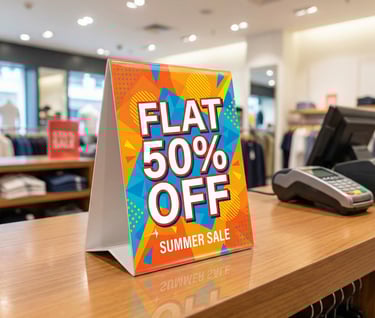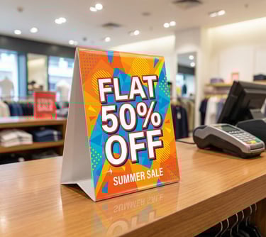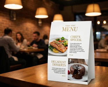 Tent Cards are simple, self-standing display prints placed on tables, counters, or desks to share offers, information, or branding. Their folded triangular design makes them sturdy and easy to use anywhere. Widely used in restaurants, retail stores, and events, they neatly present menus, QR codes, or promotions, helping businesses grab attention and connect with customers in a natural, effective way.